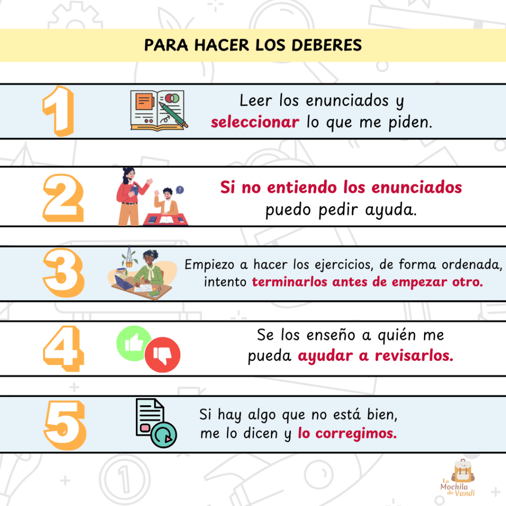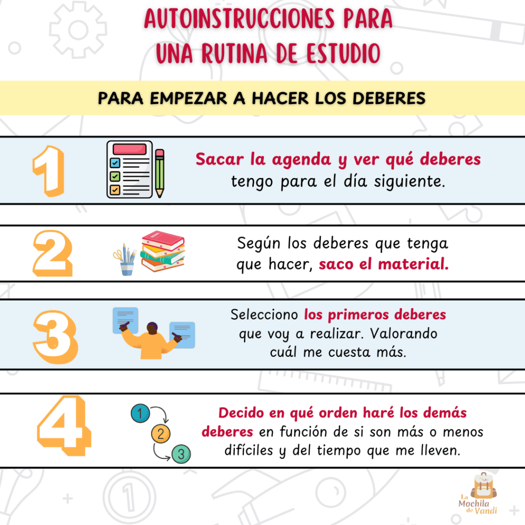 Auto-instrucciones para una rutina de estudio Las auto-instrucciones son un conjunto de pasos para llevar a cabo una actividad de la forma más autónoma posible. Ayudan a estructurar los procesos que hay que realizar para llevar a acabo algo tan complejo como hacer los deberes. Desárgalo aquí
