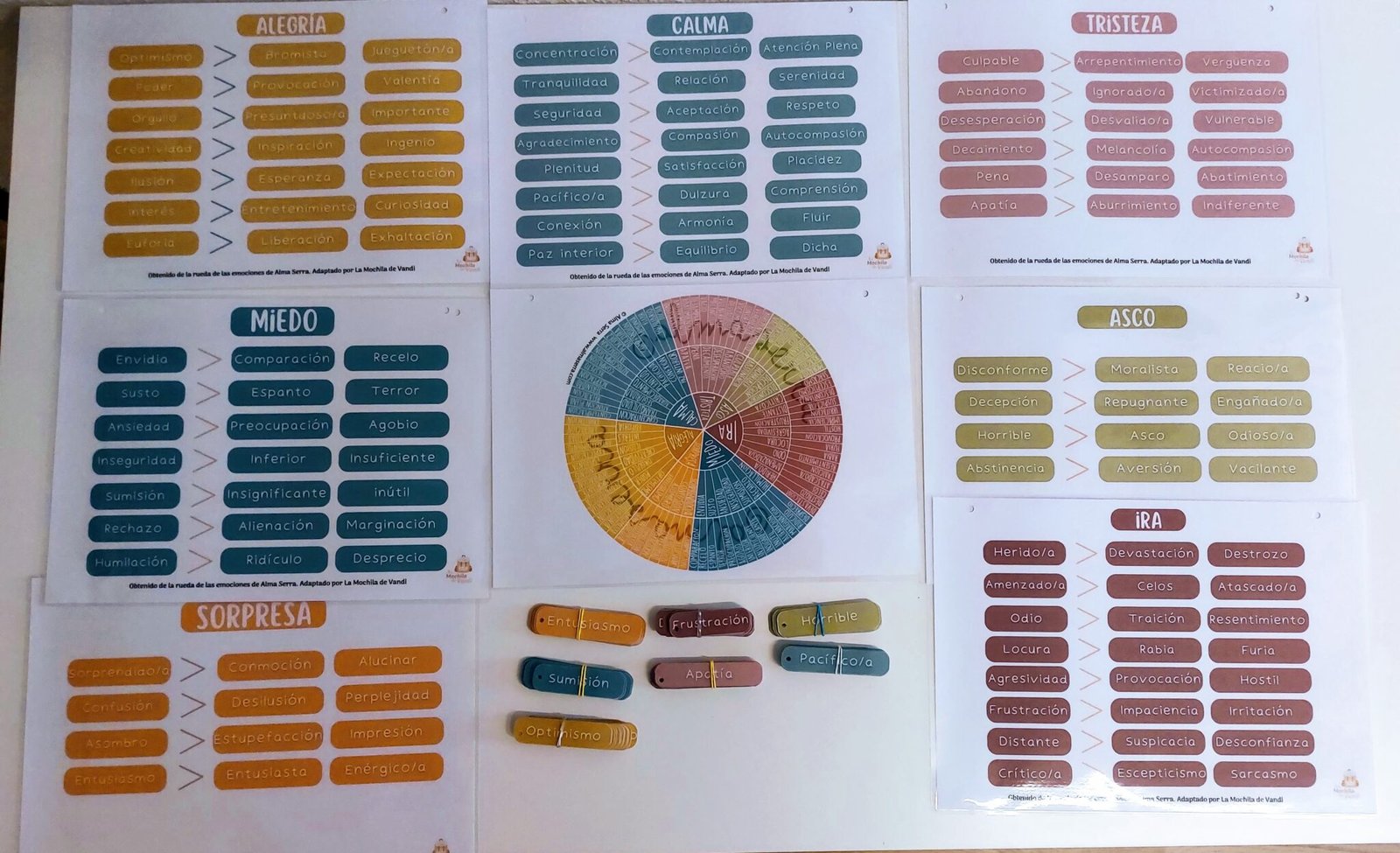 Cómo veis en la imagen, el recurso es la rueda de las emociones de Alma Serra dividida. En cada página está una de las emociones principales y los sentimientos que pueden surgir de ella.