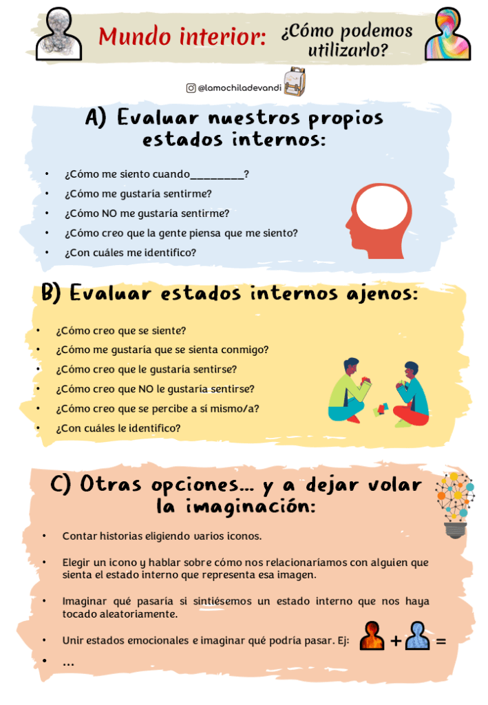 Mundo interior Un recurso pensado para identificar nuestro mundo interno, ese tan cambiante y variante, y a veces tan difícil de expresar.Está compuesto por 45 imágenes con la silueta de la persona, y una hoja con posibles usos del recurso. *Al final de la página tenéis el botón para descargarlo. Posibilidades de uso Haz clic aquí para descargarlo Disponible en la Tienda